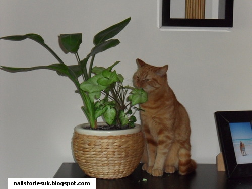 And here is a pic of my little tiger Eggbert munching on my living room plant that we always try to rescue from him. Don't worry, it's not poisonous, we've taken a sample to check! He would be munching on those bees in the garden if I let him!