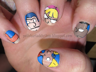 My cousin is in town, staying at my aunt's house to take care of her dogs. My aunt that broke her hip is now stuck in a rehab hospital for the time being. Cassidy has been a great help is house-sitting. She's young and artistic so she was happy to be my hand model for some cartoon nail art. :) You may remember her nails because she also modeled for my Doug nail art. We had a fun afternoon of pizza, painting, and watching old 3rd Rock From The Sun episodes. Lol